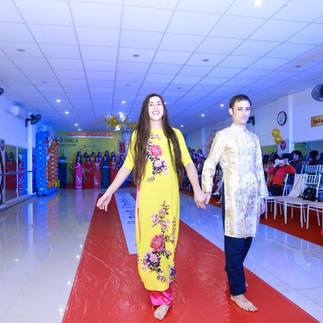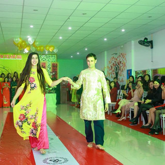 When one of our slightly English speaking friends at the studio, Thu Thao, found this out, she informed the owner and we were asked to perform a song "Hello, Vietnam," at the Tet Lunar New Year Party on Jan, 27th, 2018. In Addition, a local fashion designer was planning a fashion show for the NYE celebration. She invited us to be the only foreigners, and the only couple, to model in this show. She impressively custom tailored traditional Vietnamese Ao Dai (Ow-Zai) for all of us models to strut the runway in. This was truly an honor and a unique cultural experience.